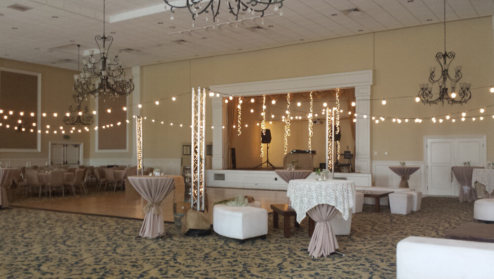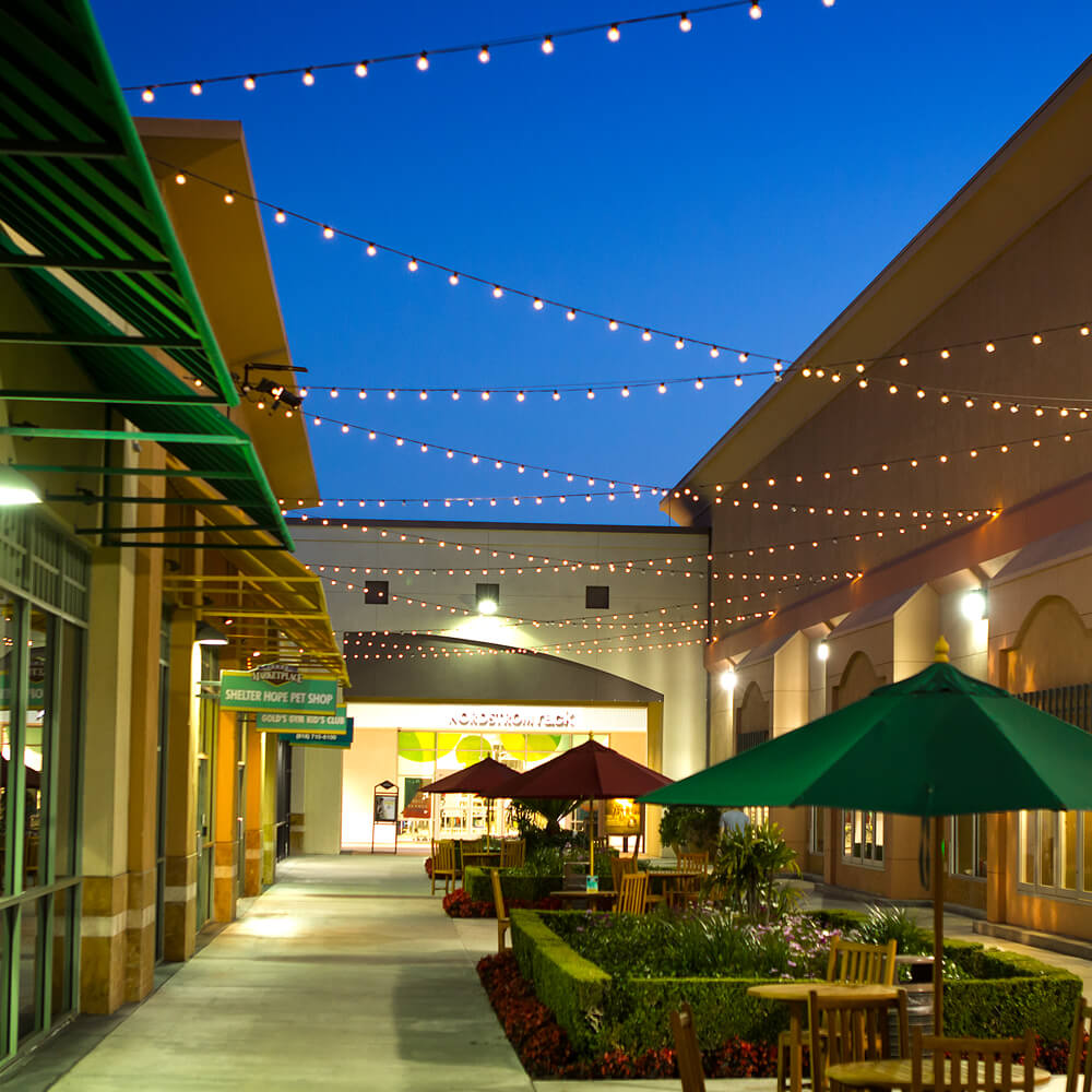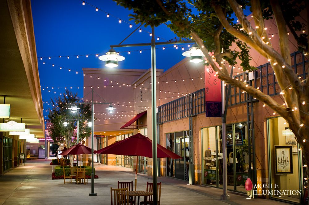 String lighting and other permanent lighting installed in a shopping center by Mobile Illumination