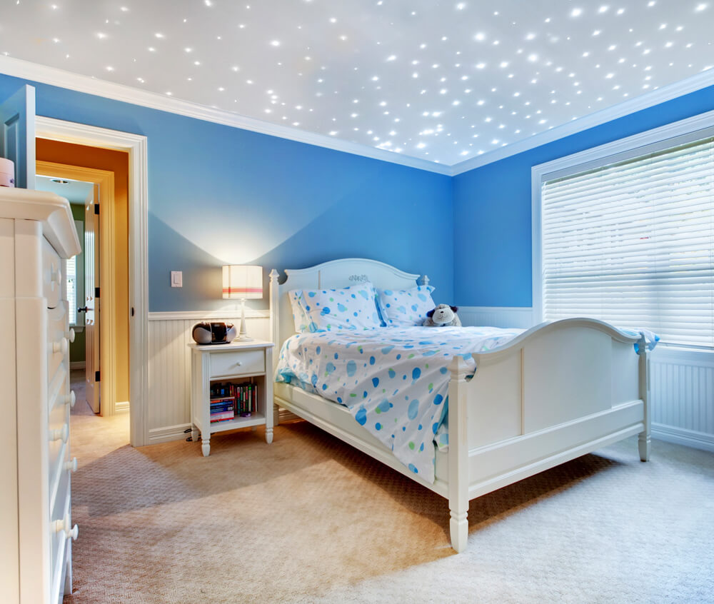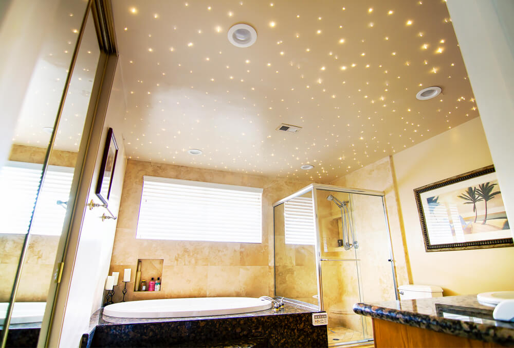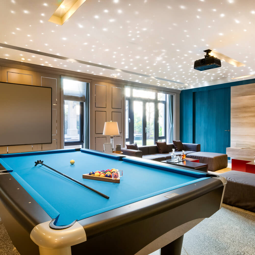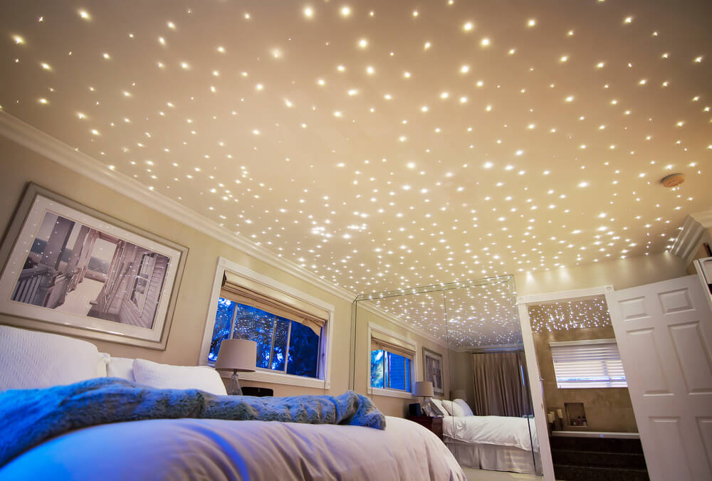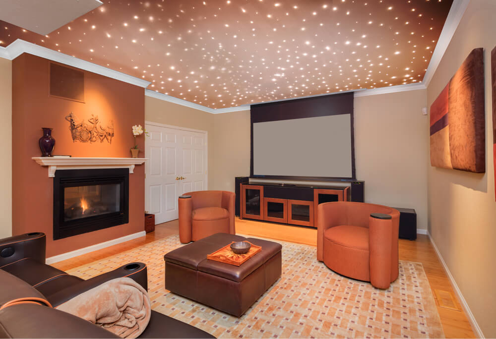 star ceiling done in red for a home theater. The room's dominant color is red due to the lighting