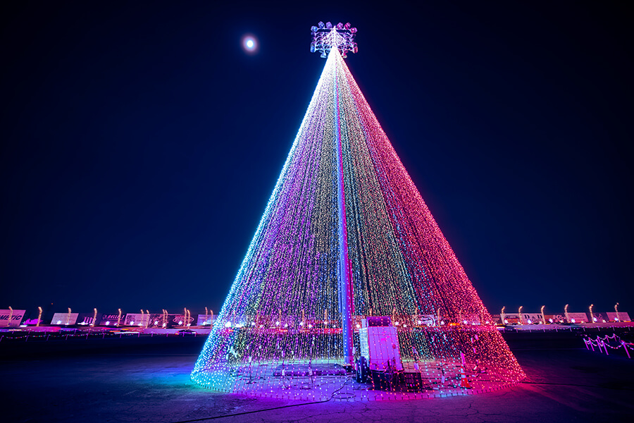 Holiday lighting for a commercial shopping center with a large christmas tree as a centerpiece